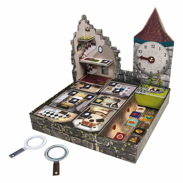 Inhoud: Spelbord, 24 kaartjes met kostbare voorwerpen, 12 klok-kaartjes, de deur van de geheime gang en de spelregels.